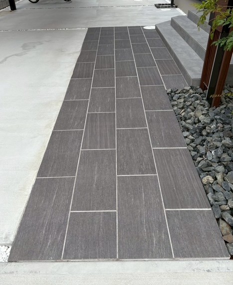 アプローチにはアイコットリョーワの繊細な石目模様のクラレットを敷き、