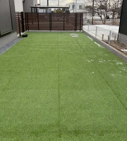 ▼ お庭には一面、リアリーターフ(人工芝)を施工させていただきました。