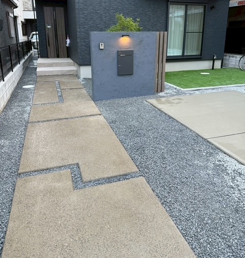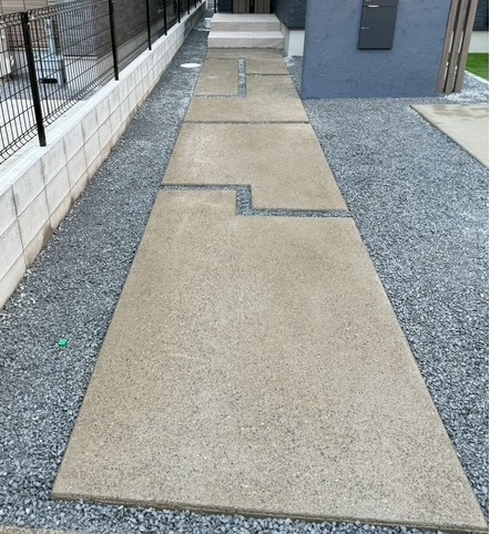 コンクリート洗い出し仕上げのアプローチに砂利目地でデザイン性を持たせ、